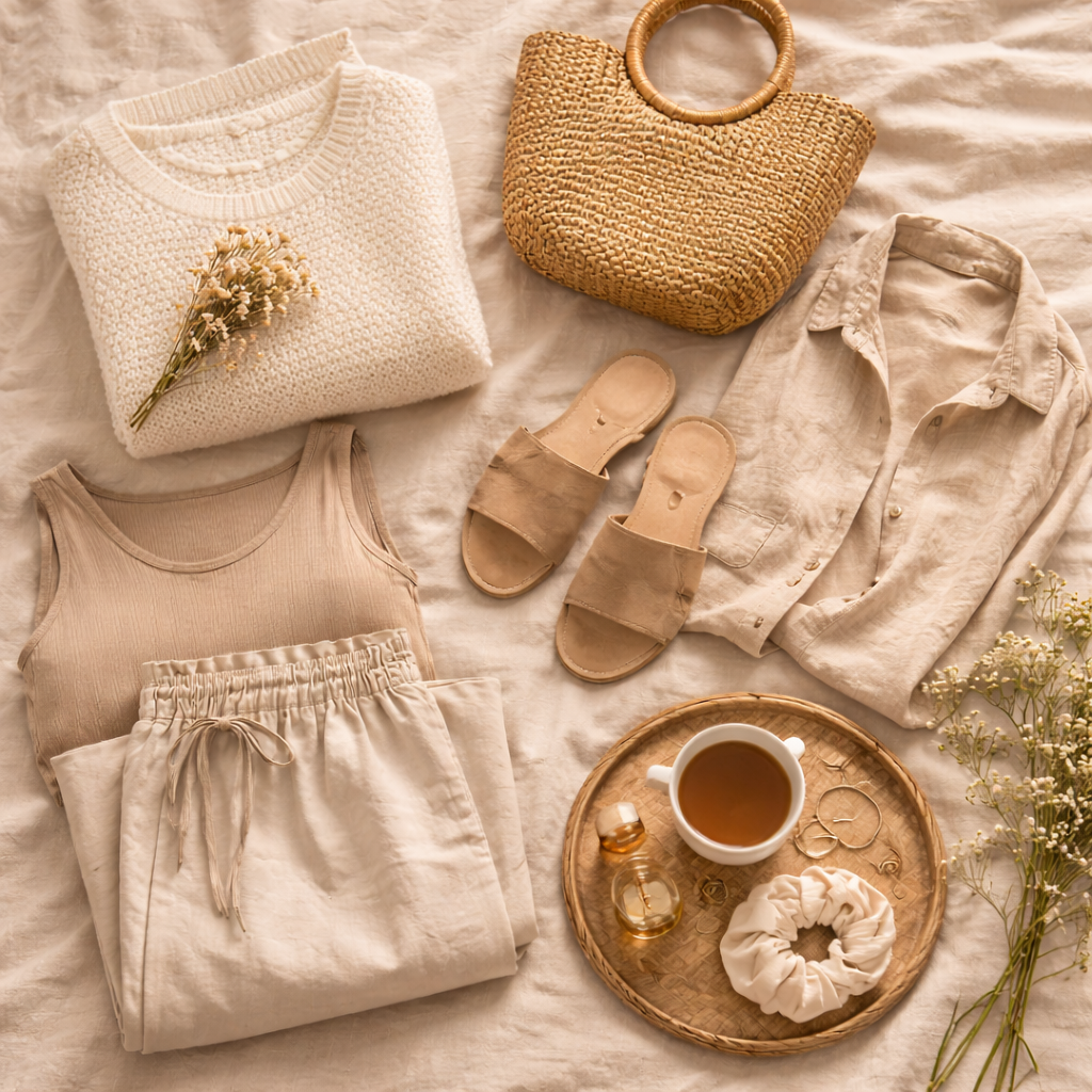 Lemari pakaian yang terdiri dari potongan-potongan dasar berkualitas memudahkan proses berpadu padan. Kemeja putih, celana linen, sweater lembut, atau rok sederhana dapat dikombinasikan dalam berbagai cara tanpa terlihat berlebihan. Kesederhanaan ini menciptakan rasa percaya diri yang alami.